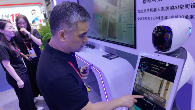在第六届消博会首次设立的科技消费展区,“杭州六小龙”之一群核科技带来全新的AI空间设计解决方案“酷家乐AI设计师”,它能够赋予具身智能机器人专业的空间设计服务能力,实现与消费者的实时互动。