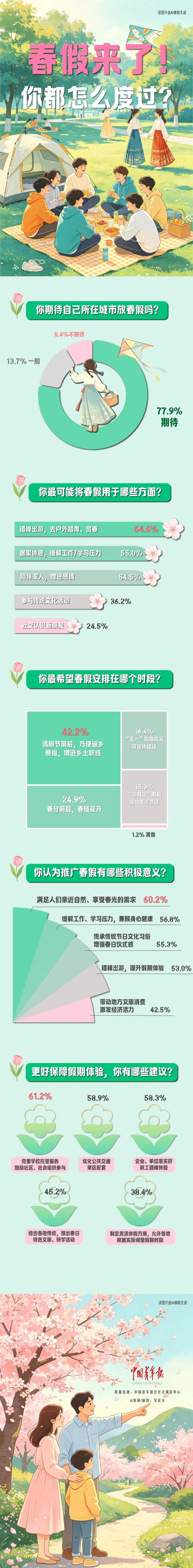 2026年政府工作报告提出“支持有条件的地方推广中小学春秋假”。最近,多地中小学、高校试点推行春假。本周,中国青年报社社会调查中心的一项调查显示,近八成(77.9%)受访青年期待所在城市放春假。64.6%的受访青年想利用春假错峰出游,去户外踏青、赏春。六成(60.2%)受访青年认为春假能满足人们亲近自然、享受春光的需求。超六成(61.2%)受访青年希望完善学校托管服务,鼓励社区、社会组织参与,解决双职工家庭看管难题。