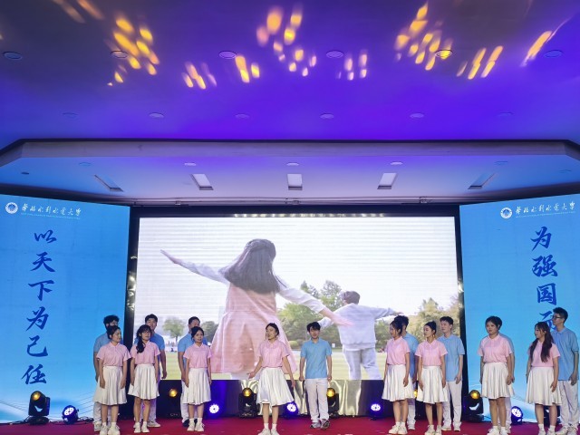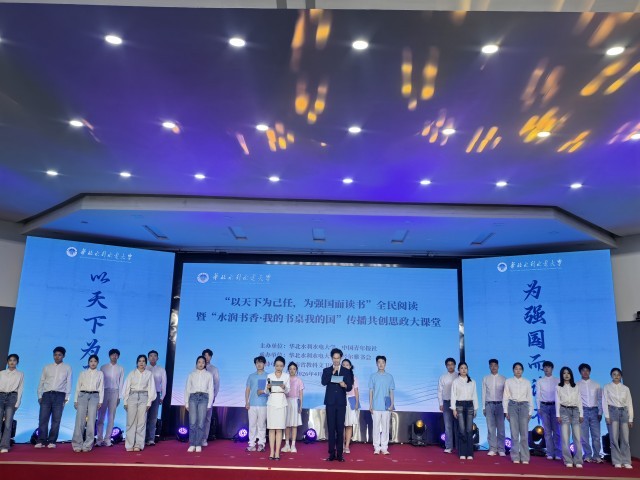 最美人间四月天,正是读书好时节。启动仪式现场亮点纷呈,经典诵读与鲜活故事交相辉映。古诗词联诵让师生们穿越古今,在经典中感悟文化底蕴与时代精神;诵读舞蹈《月光下的中国》、诗朗诵《兰亭集序》、师生合诵《春》等节目,则以艺术形式传递书香力量,点燃家国情怀。华北水利水电大学研究生支教团代表王廷煜、王怡然讲述了13年接力支教的动人故事;教师代表平晓莹以《家国记忆:一对五十年代大学生的时代背影》为引,讲述老一辈知识分子扎根戈壁、一生许国的感人故事;与三峡大坝实习师生的实时连线,将大思政课堂搬到大国重器现场,让学子在校园和工程一线感受“有字之书”与“无字之书”;华水校友代表张志华、陈晓楠、陈笑笑三人结合自身奋斗历程,讲述从书斋走向岗位、深耕水利与实业一线的故事。最后,华北水利水电大学与会师生以《“为强国而读书”倡议》为心声,共同许下“强国有我”的铿锵誓言。