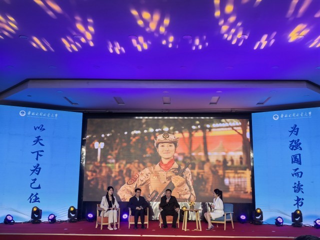 4月22日下午,“以天下为己任,为强国而读书”全民阅读暨“水润书香·我的书桌我的国”传播共创思政大课堂在华北水利水电大学启动。图为三代华水校友同台分享《从书斋到岗位:在强国征程中展现华水人的风采》。中青报·中青网记者 潘志贤/摄
