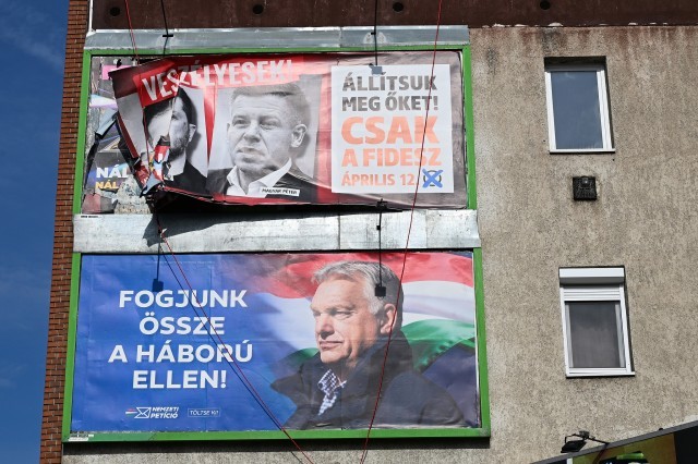 4月10日,匈牙利布达佩斯,街头悬挂着印有欧尔班(下)和毛焦尔(上)形象的竞选海报。 视觉中国供图