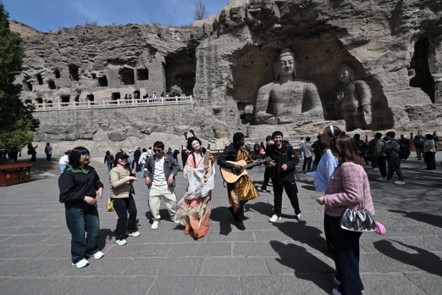 在云冈石窟,身着传统服装的演员和游客互动。(新华社记者詹彦 摄)