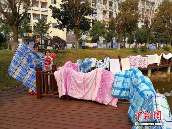2月19日,长沙一高校的两位同学正在人工湖畔晾晒被子。当日恰逢开学前一天,长沙结束阴冷天气,气温达到21℃。陆续返回校园的同学,纷纷拿出“沉睡”了一寒假的被子进行晾晒,迎接新学期的到来。卢文伟 摄