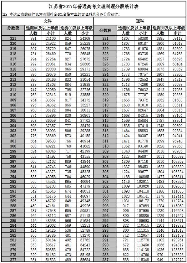 人民网北京6月25日电(赵英梓 实习生方萌萌)江苏教育考试院最新公布2017年普通高考成绩分段统计表,详细如下:
