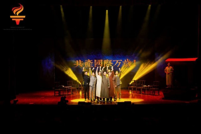 12月5日,浙江嘉兴,以中共“一大”会议为背景的原创话剧《初心》在嘉兴大学初心剧场上演,大学生演员们高呼“共产国际万岁”。主办方供图