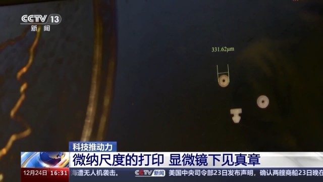 总台记者 窦筠韵:我们在显微镜下面可以看到之前用肉眼非常难以看到的这个尘埃,变成了这样的一个圆孔。那么这样的一个圆孔直径只有十几微米,那是一根头发丝都难以进入的,这个材料目前是能用于眼部手术。这台就是3D微纳打印机。如果想要打印东西,只需要在旁边电脑上进行设计,随后点击操作就可以进行打印。我们看到现在工作人员在给我们设计了一个CCTV科技推动力的标识,我们开始进行现场的3D微纳打印。