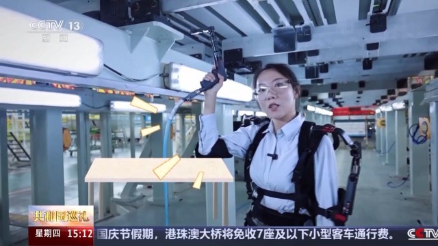 总台记者 秦祎:看我穿的这身,是不是有点像铠甲勇士?我现在是在中国航空工业集团西飞的运-20部装生产线,而我穿的这身,就是工作人员在进行装配时,会穿着的一种辅助装备,专业名称叫“外骨骼”,它的作用就是帮助工作人员更加省力、舒适地开展工作。具体怎么省力,怎么舒适呢?我来给大家演示一下。