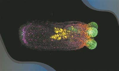 通过使用四种不同的颜色来标记特定的基因,研究人员可以看到每个基因在星形海葵体内活跃的位置,从而帮助他们了解完整动物和再生动物的身体组织。图片来源:欧洲分子生物学实验室