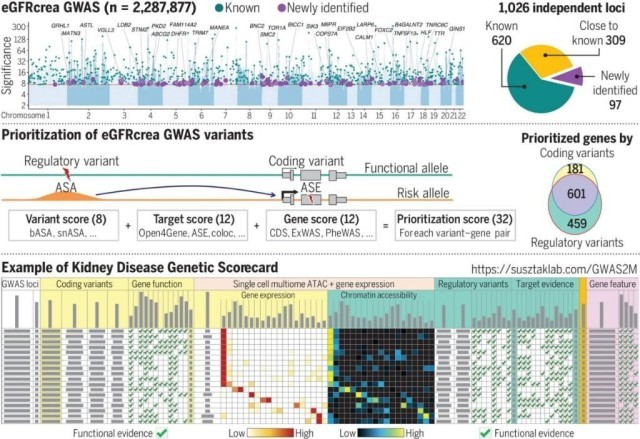 “肾脏疾病遗传记分卡”揭示了肾功能的遗传结构以及可能的标靶基因。图片来源:《科学》网站