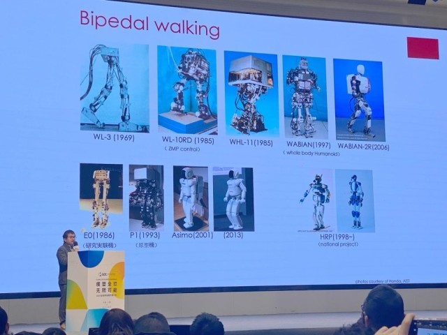 汪伟在主题演讲中介绍世界上第一台人形机器人Wabot-1诞生经过。