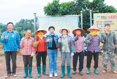 如今,徐咏梅带领团队还在发力建设热带水果种苗园,并已研发出火龙果迭代品种“临家红韵”。图为徐咏梅(左四)与种植户在火龙果新品种展示基地。