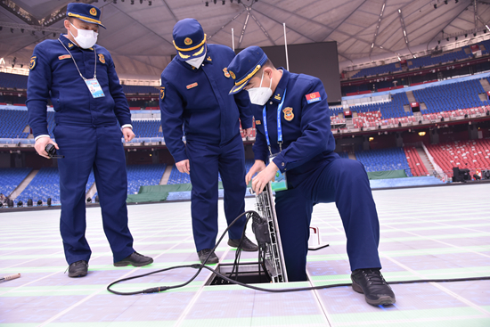 消防安保团队对国家体育场LED屏幕背后的电器元件和线路进行日常检查。北京消防供图
