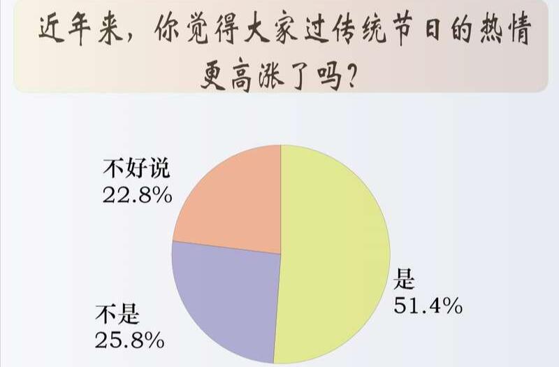 调查中,51.4%的受访青年觉得近年来大家过传统节日的热情更高涨了,25.8%的受访青年觉得不是,22.8%的受访青年表示不好说。
