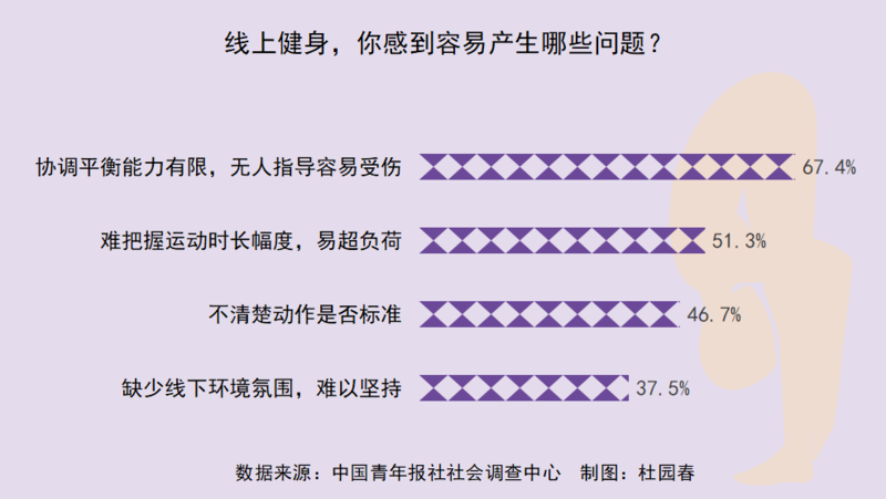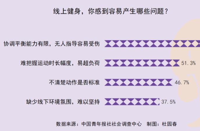 日前,中国青年报社社会调查中心联合问卷网(wenjuan.com),对2008名受访者进行的一项调查显示,进行线上健身时,67.4%的受访者指出协调平衡能力有限,无人指导容易受伤。51.3%的受访者认为难把握运动时长幅度,易超负荷。