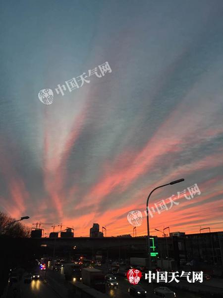 今晨,北京出现朝霞,天空一片缤纷。(摄影:关禺)