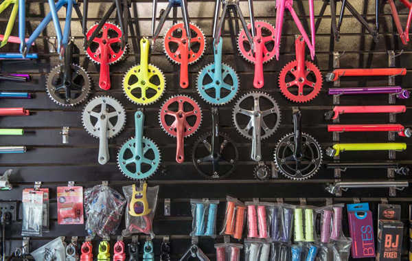 自行车店铺中摆放的“死飞”零件。“(外界的)误解还是蛮大的,首先名字里一个‘死’字,听上去感觉就不好。实际上我觉得,‘死飞’只是骑行的习惯和方式不同而已。”
