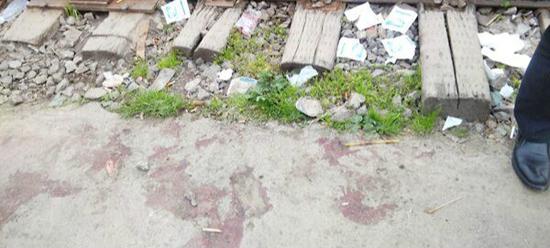 事发地铁轨地上,还有血迹和装止血纱布的纸袋。周边群众正在谈论此事。一位市民称,几年前,这里曾出过事,相关单位也贴过公告,让大家走铁轨旁边的小路或者绕行。