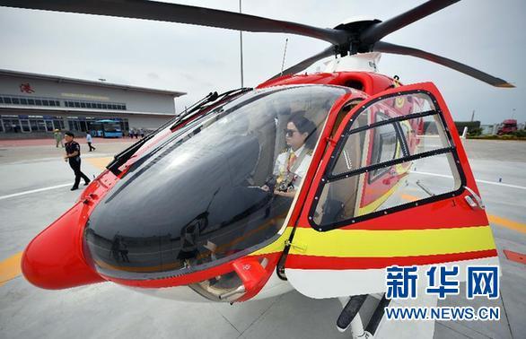 4月28日,直升飞机在海口新海港码头准备起飞。当日,北京首航直升机股份有限公司联合海南港航控股股份有限公司在海口新海港举行琼州海峡直升机摆渡飞行开航仪式。首航直升机运营的空客H135型直升机,从海南省海口新海港码头起飞,飞往广东省湛江市徐闻海安港,空中飞行时间仅需10分钟,比传统轮渡快了2个多小时,单人票价为898元。新华社记者郭程摄
