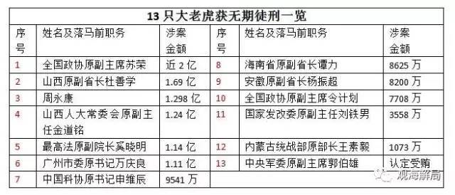 值得注意的是,虽然均获无期徒刑,但这13只大老虎的涉案金额相差悬殊。除了未公开的郭伯雄,其中最多的是苏荣,近2亿,最少的是王素毅,1073万。换句话说,最高的是最低的近20倍。