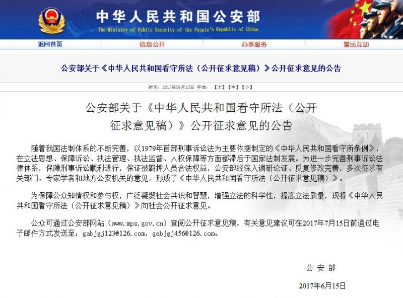 近日,公安部在官方网站发布了由其起草的《看守所法(公开征求意见稿)》,向社会公开征求意见。