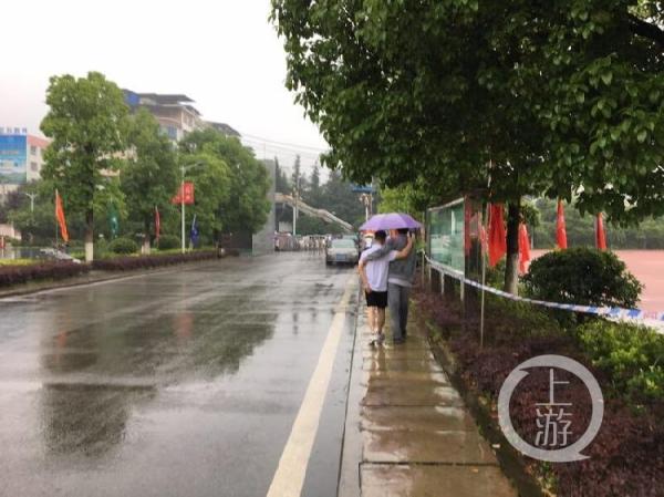 本应早上8点开始的体测因雨延后,第一组开跑时已近8点30分。再往后,不住的雨水还有加急的趋势,陪考的家长和学生们在校门口外等候,撑着雨伞来回走着,一边向操场方向张望去。