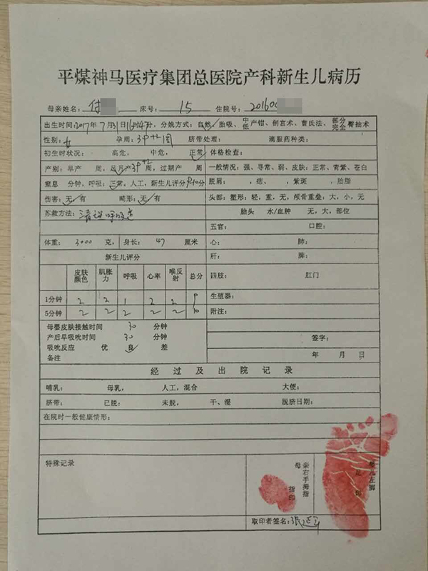 张传云也提到给新生儿出生后即刻佩戴腕带。她所在的医院产科使用的是“双腕带”——给新生儿的手腕、脚腕各戴上一个柔软的腕条。这些腕带标记有新生儿的身份信息,是其身份标识,直至其出院时,才会被取下。婴儿出生后采集的足印和母亲的指印,医院会永久存档。