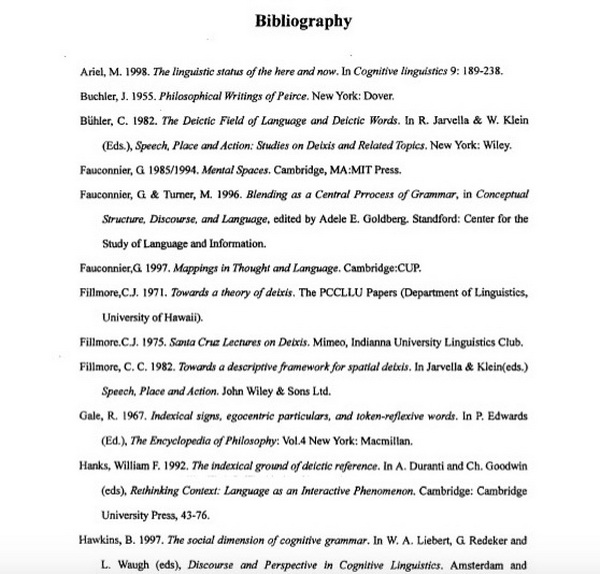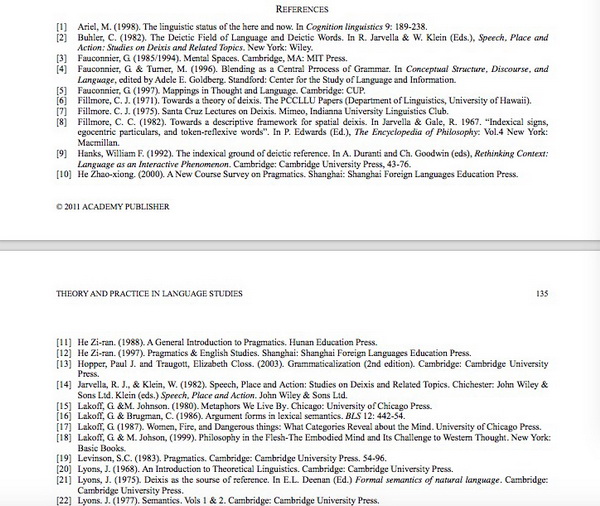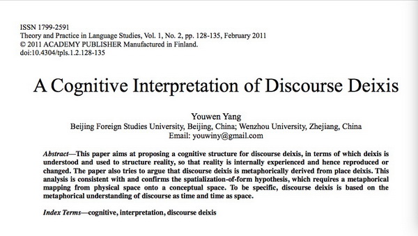 杨佑文论文则在结语“Conclusion”第一段写道:“This paper aims at proposing a cognitive structure for discourse deixis, in terms of which deixis is understood and used to structure reality, so that reality is internally experienced and hence reproduced or changed. The approach to deixis adopted in the paper originates in cognitive semantics and comprises cognitive models, image schematic and metaphorical structures as in Lakoff (1987) and Lakoff and Johson (1999), mental spaces as in Fauconnier(1985, 1997), and prototype structure as in Rosch (1978) and Taylor (1995).”