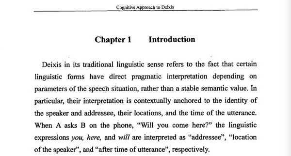 比如,孙中勤论文第一部分“Introduction”开头写道:“Deixis in its traditional linguistic sense refers to the fact that certain linguistic forms have direct pragmatic interpretation depending on parameters of the speech situation, rather than a stable semantic value. In particular, their interpretation is contextually anchored to the identity of the speaker and addressee, their locations, and the time of the utterance. When A asks B on the phone, ‘Will you come here?’the linguistic expressions you, here, and will are interpreted as ‘addressee’, ‘location of the speaker’, and ‘after time of utterance’, respectively.”