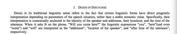 杨佑文论文第一部分“Deixis in Discourse”的第一段内容是:“Deixis in its traditional linguistic sense refers to the fact that certain linguistic forms have direct pragmatic interpretation depending on parameters of the speech situation, rather than a stable semantic value. Specifically, their interpretation is contextually anchored to the identity of the speaker and addressee, their locations, and the time of the utterance. When A asks B on the phone, ‘Will you come here?’the linguistic expressions ‘you’, ‘here’(and even ‘come’), and ‘will’ are interpreted as the ‘addressee’, ‘location of the speaker’, and ‘after time of utterance’, respectively.”