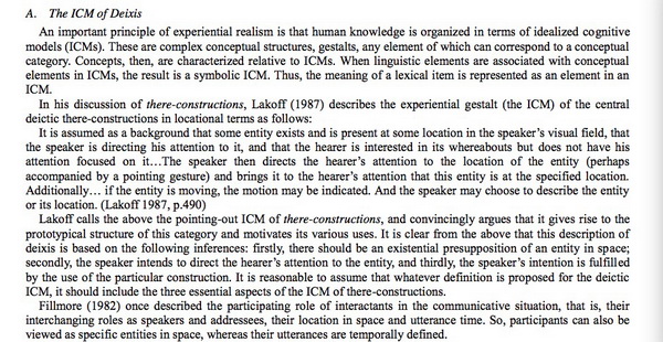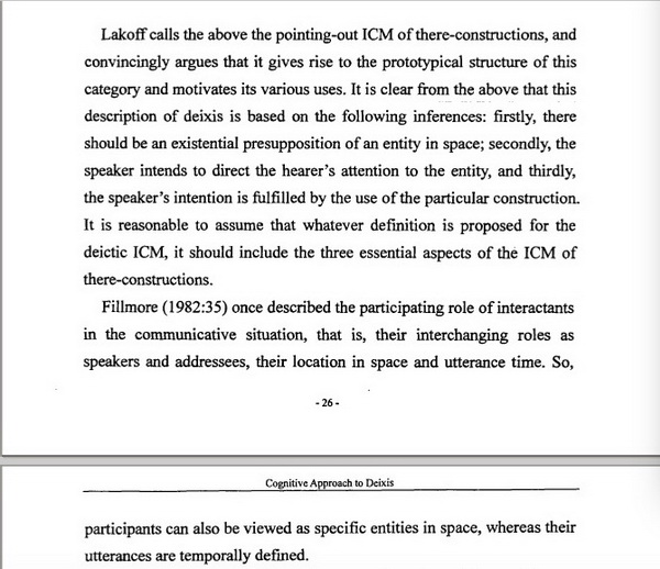 杨佑文论文在题目相同的小节“The ICM of Deixis”中也写道:“Lakoff calls the above the pointing-out ICM of there-constructions, and convincingly argues that it gives rise to the prototypical structure of this category and motivates its various uses. It is clear from the above that this description of deixis is based on the following inferences: firstly, there should be an existential presupposition of an entity in space; secondly, the speaker intends to direct the hearer's attention to the entity, and thirdly, the speaker's intention is fulfilled by the use of the particular construction. It is reasonable to assume that whatever definition is proposed for the deictic ICM, it should include the three essential aspects of the ICM of there-constructions.”