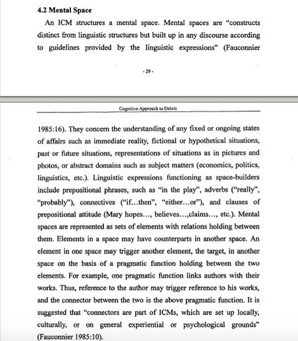 还比如,孙中勤论文第四部分第二节“Mebtal Space”有一段内容表述为:“An ICM structures a mental space. Mental spaces are ‘constructs distinct from linguistic structures but built up in any discourse according to guidelines provided by the linguistic expressions’ (Fauconnier1985:16). They concern the understanding of any fixed or ongoing states of affairs such as immediate reality, fictional or hypothetical situations, past or future situations, representations of situations as in pictures and photos, or abstract domains such as subject matters (economics, politics, linguistics, etc.). Linguistic expressions functioning as space-builders include prepositional phrases, such as ‘in the play’, adverbs (‘really’, ‘probably’), connectives (‘if...then’, ‘either...or’), and clauses of prepositional attitude (Mary hopes...,believes...,claims..., etc.). Mental spaces are represented as sets of elements with relations holding between them. Elements in a space may have counterparts in another space. An element in one space may trigger another element, the target, in another space on the basis of a pragmatic function holding between the two elements. For example, one pragmatic function links authors with their works. Thus, reference to the author may trigger reference to his works, and the connector between the two is the above pragmatic function. It is suggested that ‘connectors are part of ICMs, which are set up locally, culturally, or on general experiential or psychological grounds’ (Fauconnier 1985:10).”