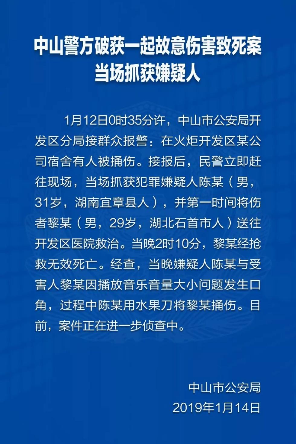 1月12日0时35分许,中山市公安局开发区分局接群众报警:在火炬开发区某公司宿舍有人被捅伤。接报后,民警立即赶往现场,当场抓获犯罪嫌疑人陈某(男,31岁,湖南宜章县人),并第一时间将伤者黎某(男,29岁,湖北石首市人)送往开发区医院救治。当晚2时10分,黎某经抢救无效死亡。经查,当晚嫌疑人陈某与受害人黎某因播放音乐音量大小问题发生口角,过程中陈某用水果刀将黎某捅伤。目前,案件正在进一步侦查中。