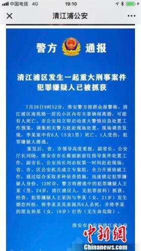 中新网南京7月28日电 (记者 崔佳明)28日,江苏淮安市发生一起重大刑事案件,已致6人死亡,1人受伤,犯罪嫌疑人已被警方抓获。