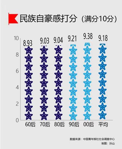 中国青年报社社会调查中心近期围绕青年思想现状进行了一系列深入的调查,得出结论,青年一代,特别是00后和90后,在价值观日趋多元的今天,依然有着坚定的家国信念,他们的民族自豪感打分分别为9.38分和9.21分(满分10分),比其他年龄段更高。他们对国家发展目标的信心度也高于其他年龄段的受访者。
