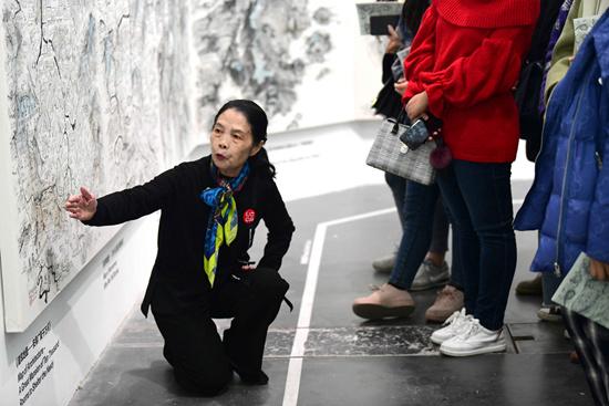 陈少勤在邱志杰的《寰宇全图》展览上,为观众导览作品:世界地图计划。和冠欣/摄