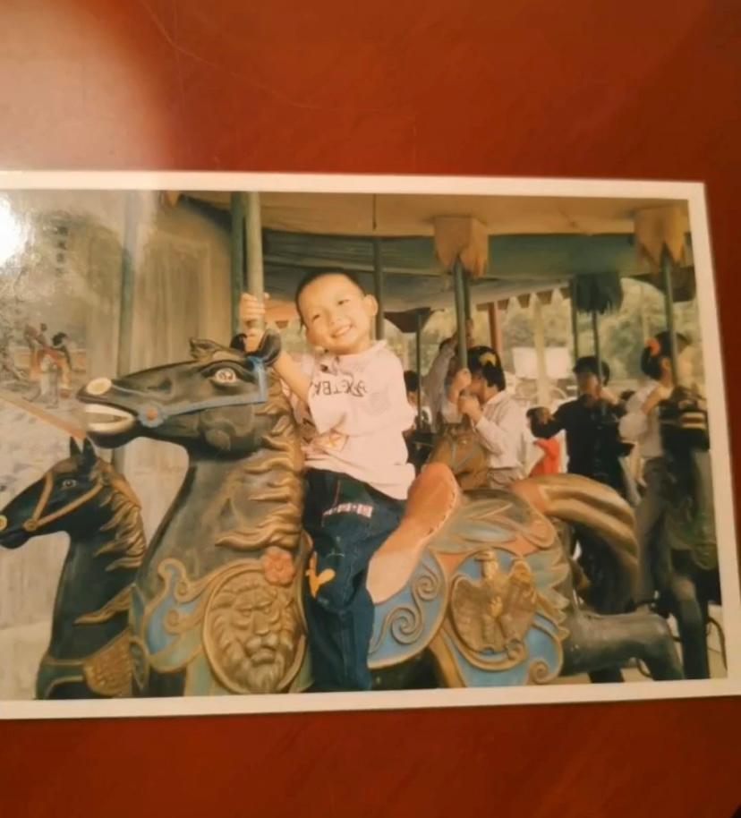姚策小时候在甘塘公园骑旋转木马。受访者供图