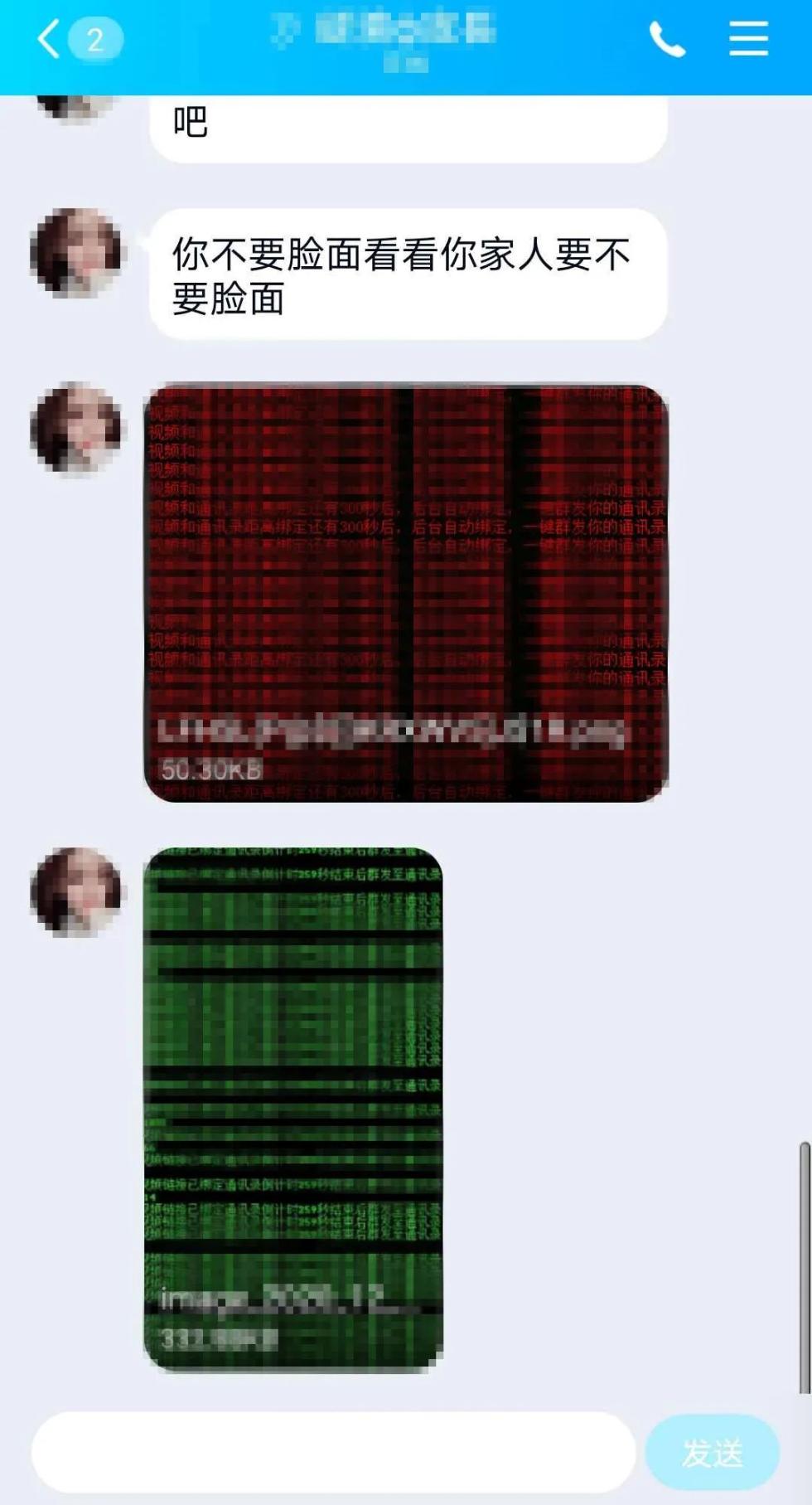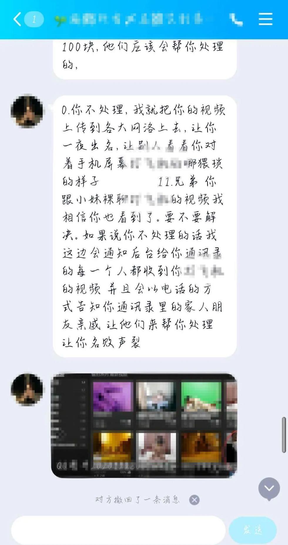 4、威胁群发进行敲诈。“美女”露出真实面目,发来受害人通讯录及裸聊的视频,要求受害人向指定账户转账。