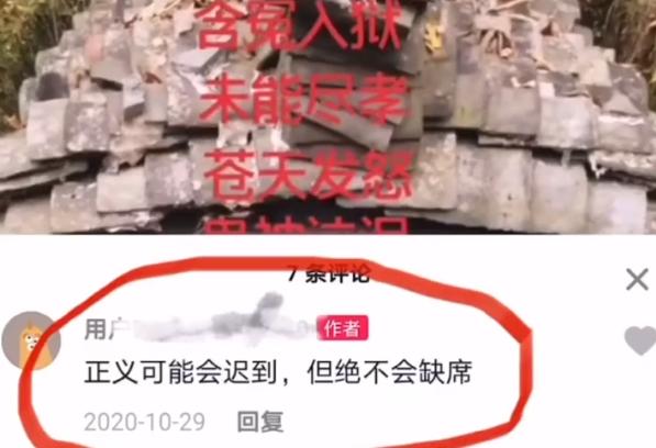 这条视频发布于去年10月28日,拍摄地点在潘楷发亡母的坟前,画面中一直出现“含冤入狱,未能尽孝”“这是一场正义与邪恶的较量”等红色字样,并在该条视频下留言称“正义可能会迟到,但绝不会缺席”。