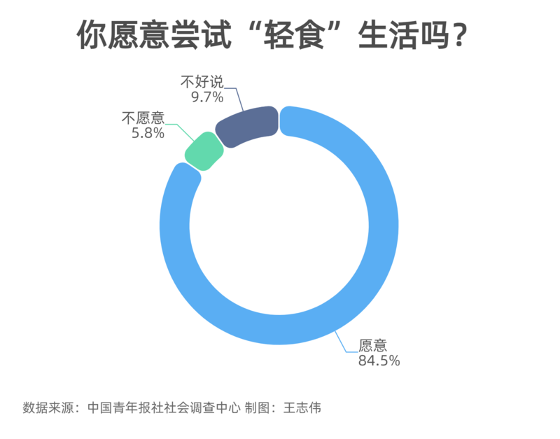 近些年,人们健康生活意识普遍提高,一种倡导低脂肪、低热量,高纤维、高饱腹感的“轻食”生活模式,受到越来越来多年轻人的欢迎。近日,中国青年报社社会调查中心联合问卷网(wenjuan.com),对1516名受访者进行的一项调查显示,84.5%的受访者表示愿意尝试“轻食”生活,90后的意愿最高。追求身体健康是受访者选择“轻食”生活的主要原因。