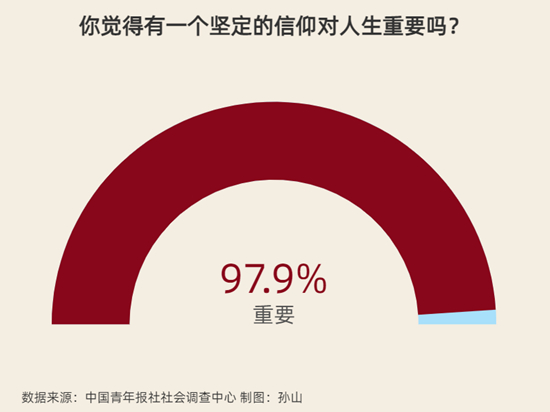 “心中有信仰,脚下有力量。”中国青年报社社会调查中心进行的“建党百年”全国青年调查显示,97.9%的受访者确认有坚定的信仰对人生是重要的,73.1%受访者表示中国共产党让自己信赖的特质是有坚定的马克思主义信仰。