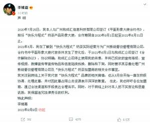 针对此事,9日下午李维嘉通过微博发布声明。他说,2020年7月25日,自己与广州和成汇信息科技有限公司签订《平面形象大使合约书》,担任“快乐方程式”奶茶产品形象大使,合作期限自2020年9月1日起至2021年8月31日止。