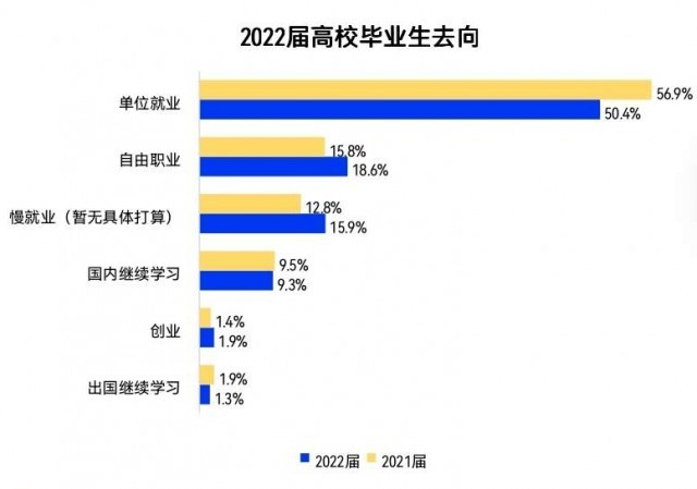除了灵活就业,一些毕业生还选择继续深造。其中,硕士研究生选择“国内继续学习”的占比11%,显著高于2021年的4.3%。据教育部统计,2022年全国研究生招生考试有457万人报名,比去年增加了80万。考研热使毕业生求职时间延后。