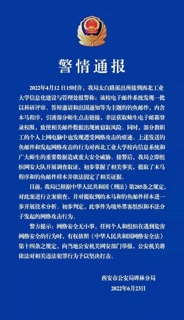 据陕西省西安市公安局碑林分局官方微博消息,针对西北工业大学电子邮件系统遭受境外网络攻击,西安市公安局23日发布警情通报称,已根据中华人民共和国刑法第285条之规定,对此案进行立案侦查,并对提取到的木马和钓鱼邮件样本进一步开展技术分析。初步判定,此事件为境外黑客组织和不法分子发起的网络攻击行为。