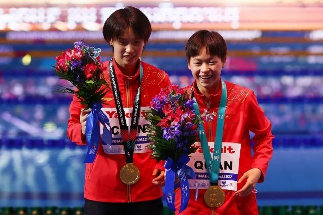 到五轮比赛结束,全红婵/陈芋汐以领先第二名69分的巨大优势夺冠,两名小将激动地拥抱在一起庆祝胜利。这枚合力拿下的金牌也让俩人双双成为了本届游泳世锦赛的“双金王”,同时也确保了中国跳水队在游泳世锦赛女子十米台双人项目上的11连冠。