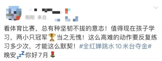 由于俩人在比赛中丝毫不差的同步性,有人形象的将俩人的动作形容为“照镜子”。从全红婵在东京奥运会上被网友送出的“水花消失术”一词,到中国跳水选手在比赛中屡屡的“断层夺冠”,再到这场比赛的“照镜子般的动作”,随着中国跳水受到越来越多人的关注和喜爱,其强大实力已经不再通过枯燥的分数来体现,而是化作了一个个深入人心的形象描述。