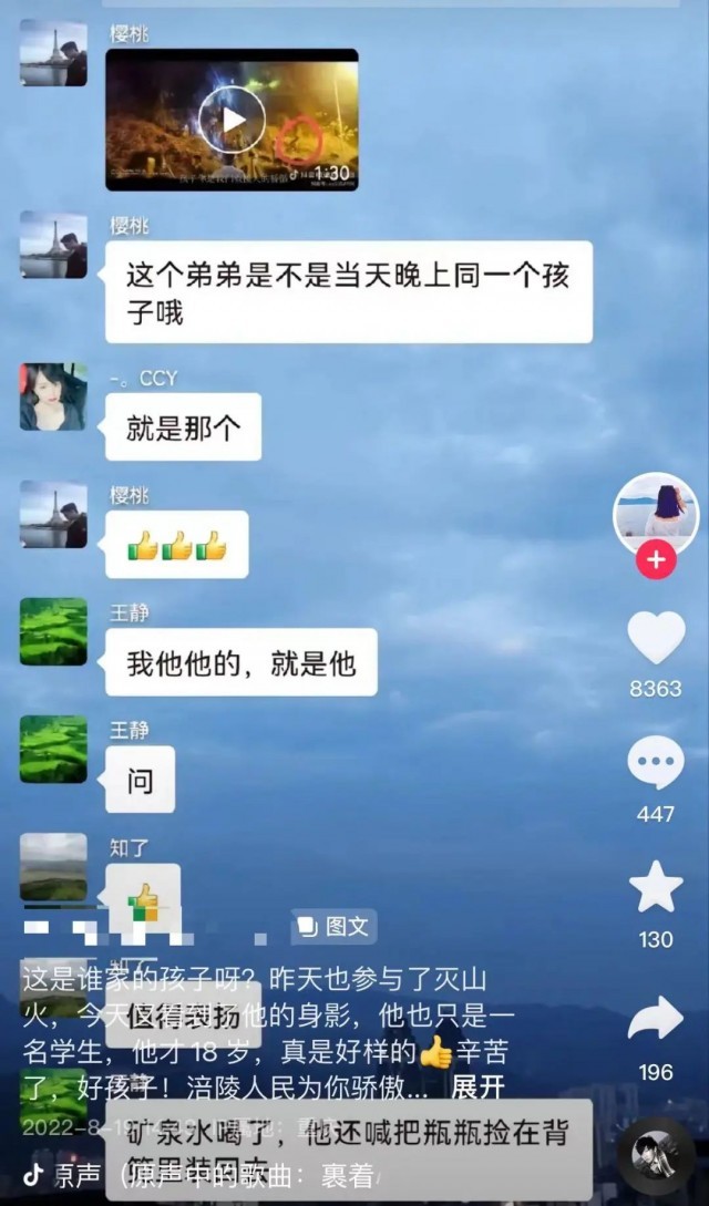 正当大家寻找他时,因为连续高温天气,他的家乡南川也同样遭遇了山火,18岁的他毅然回到了南川救火现场支援。