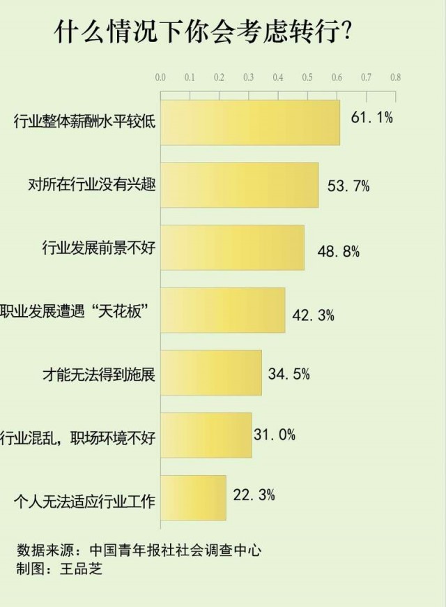 随着职业选择自由度的提升,很多人在工作中都产生过想转行的想法,但转行并不容易。在什么情况下,你会考虑转行?日前,中国青年报社社会调查中心联合问卷网(wenjuan.com),对2001名职场人士进行的一项调查显示,大家表示在行业整体薪酬水平较低(61.0%)、对所在行业没有兴趣(53.7%)、行业发展前景不好(48.8%)的情况下会考虑转行。