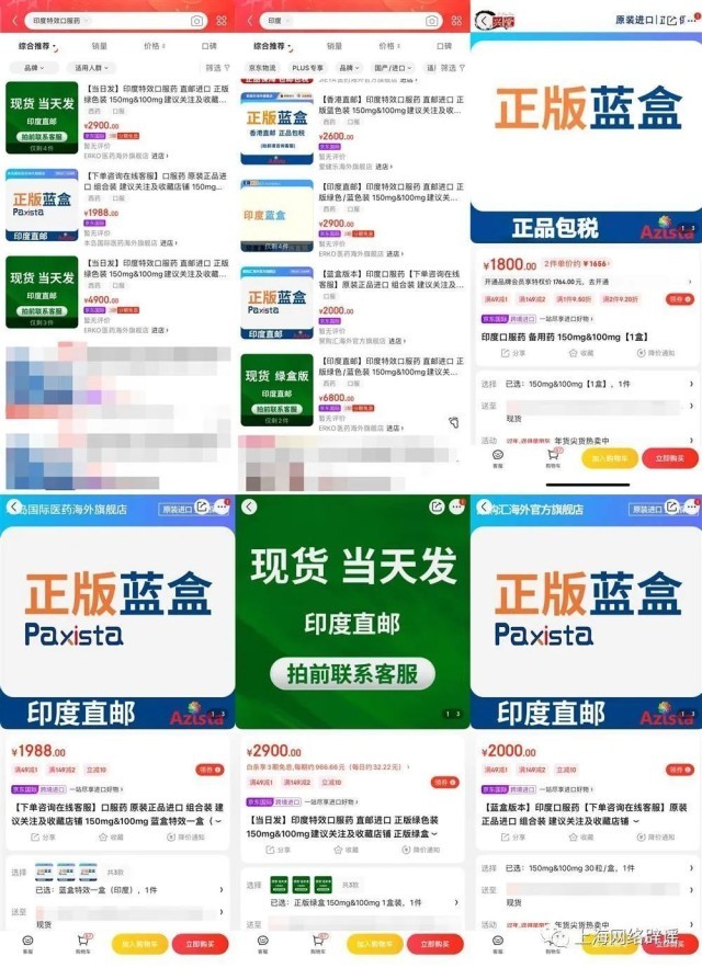 有货吗?1800元销售“正版蓝盒”的商家“德兴堂”告诉记者没有现货,需要等待30天到货。但加了商家微信后,对方推荐了孟加拉国产的另外两款Paxlovid仿制药,售价2400元和3500元一盒,均有“国内现货”;另一商家“ERKO医药海外旗舰店”正在销售2900元的“正版绿盒”,客服称有现货,印度直邮15-45天送达……