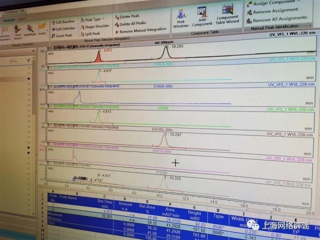 检测人员出示了多份样品的检测结果。图上最上端为正品的成分图谱,两个“峰”分别为“奈玛特韦”和“利托那韦”,往下数第三条为“奥司他韦”的成分图谱。