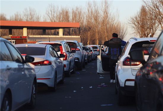 2023年1月27日,河南省周口市,车辆在高速服务区排队加油。当日是春节7天长假最后一天,各地高速公路迎来返程车流高峰。视觉中国供图